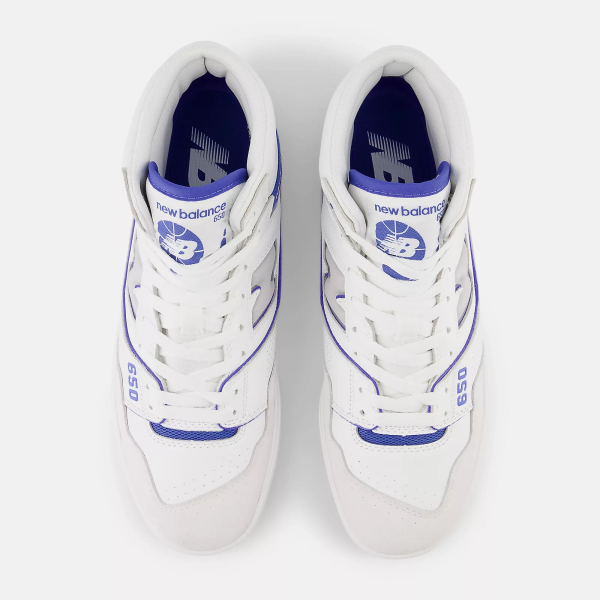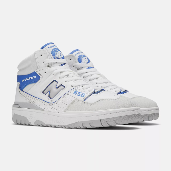 New Balance 650R BB650RWI/D — высокие кроссовки в баскетбольном стиле, вдохновлённые архивными моделями 1980-х. Белый верх и винтажные детали придают силуэту чистый, спортивный и в то же время универсальный вид.