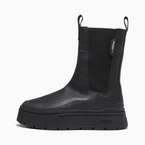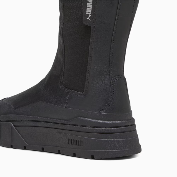 Сапоги Puma Mayze Stack Chelsea сочетают классический стиль Chelsea с современными уличными трендами. Эта модель была создана как продолжение линейки Mayze, которая славится своей массивной подошвой и стильным дизайном, вдохновленным городской культурой. Эти сапоги разработаны как кроссовки, адаптированные под осенне-зимний сезон. Основное вдохновение — городская мода, где сочетаются элегантность и практичность. Дизайн Mayze Stack Chelsea выделяется высокой подошвой и акцентом на текстурированные резиновые детали, что делает их отличным выбором для смелых и модных образов.